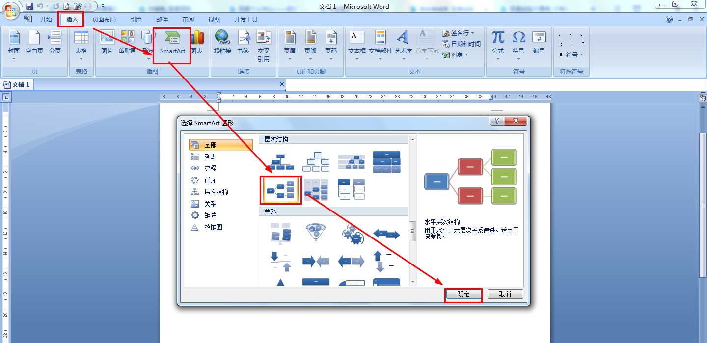 1、点击插入——然后在插图中点击SmartArt——点击水平层次结构——点击确定。