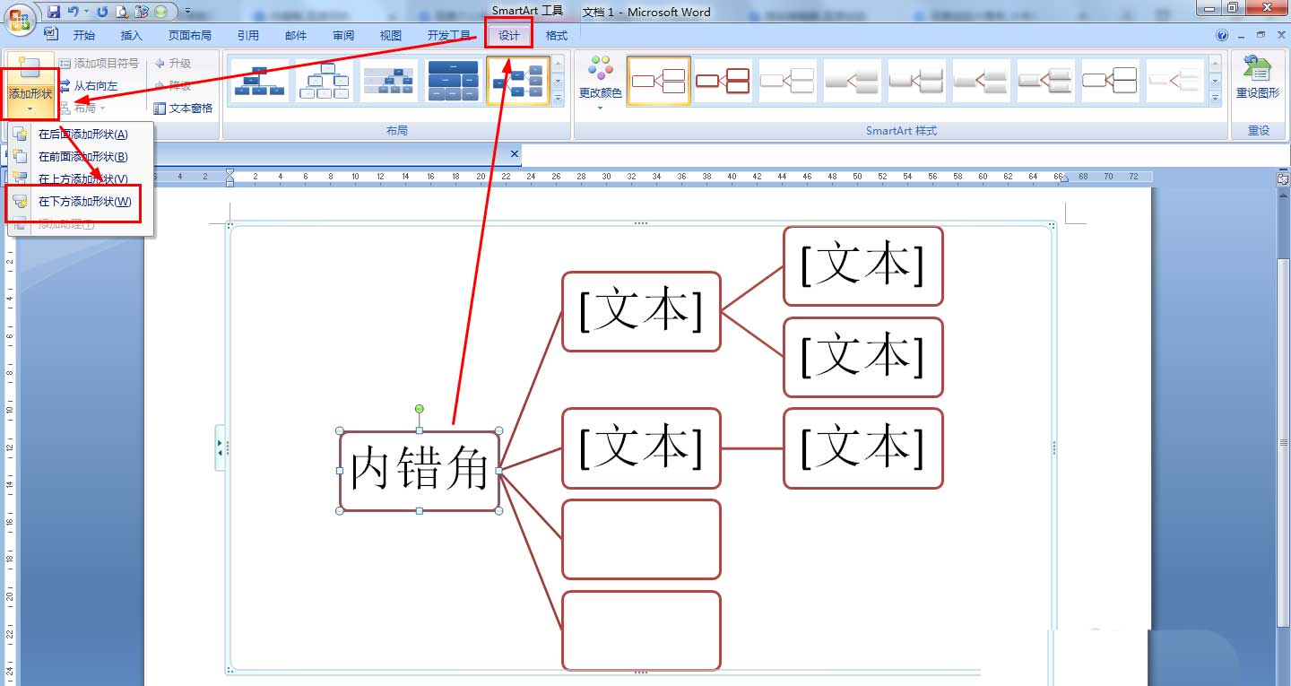 3、点击中心标题文本框——点击设计——添加形状——在下方添加形状,直到添加到四个二级分支为止。