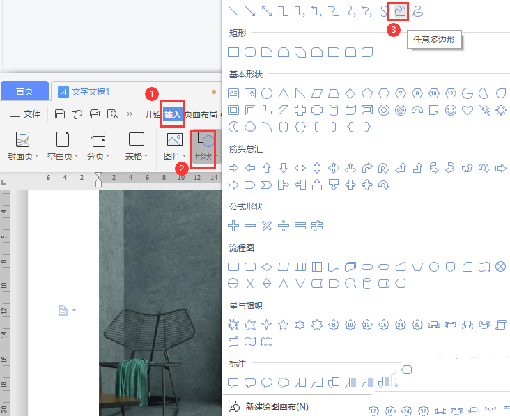 2、我们在【插入】-【形状】中找到【任意多边形】,如图所示。