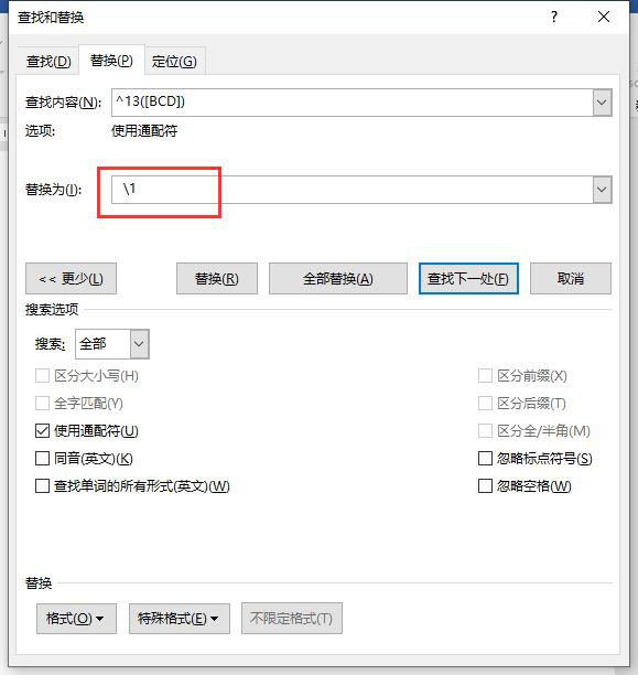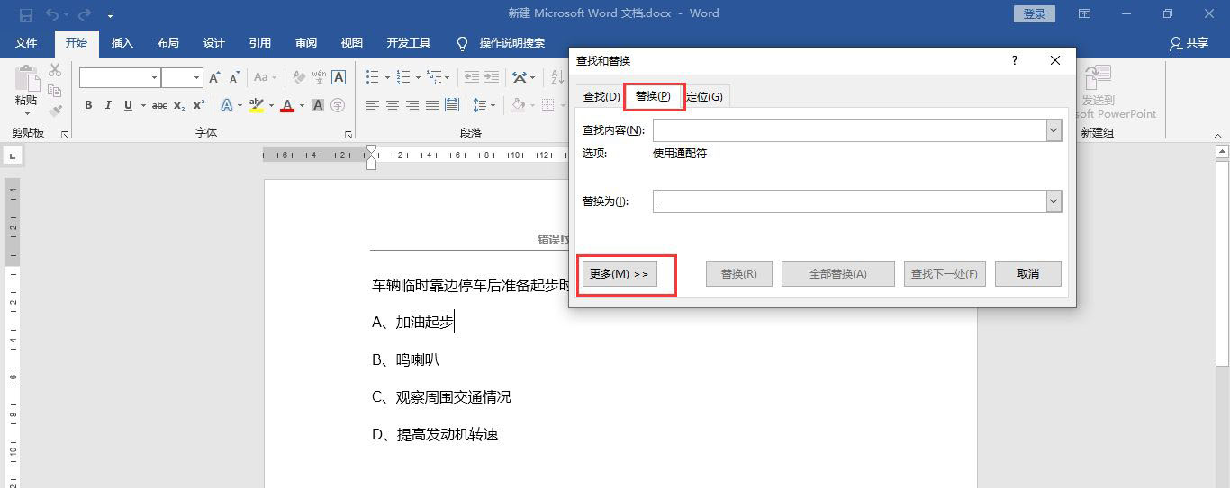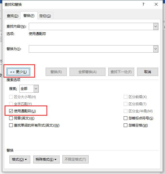 Ctrl+H调出"查找和替换"面板,默认"替换"选项卡,点击"更多"按钮。