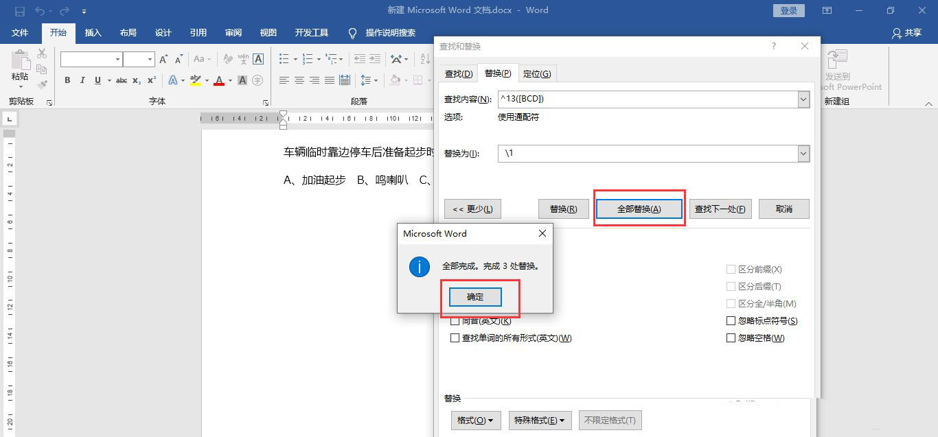 点击"全部替换"-"确定",这样就可以把将ABCD变成一行。
