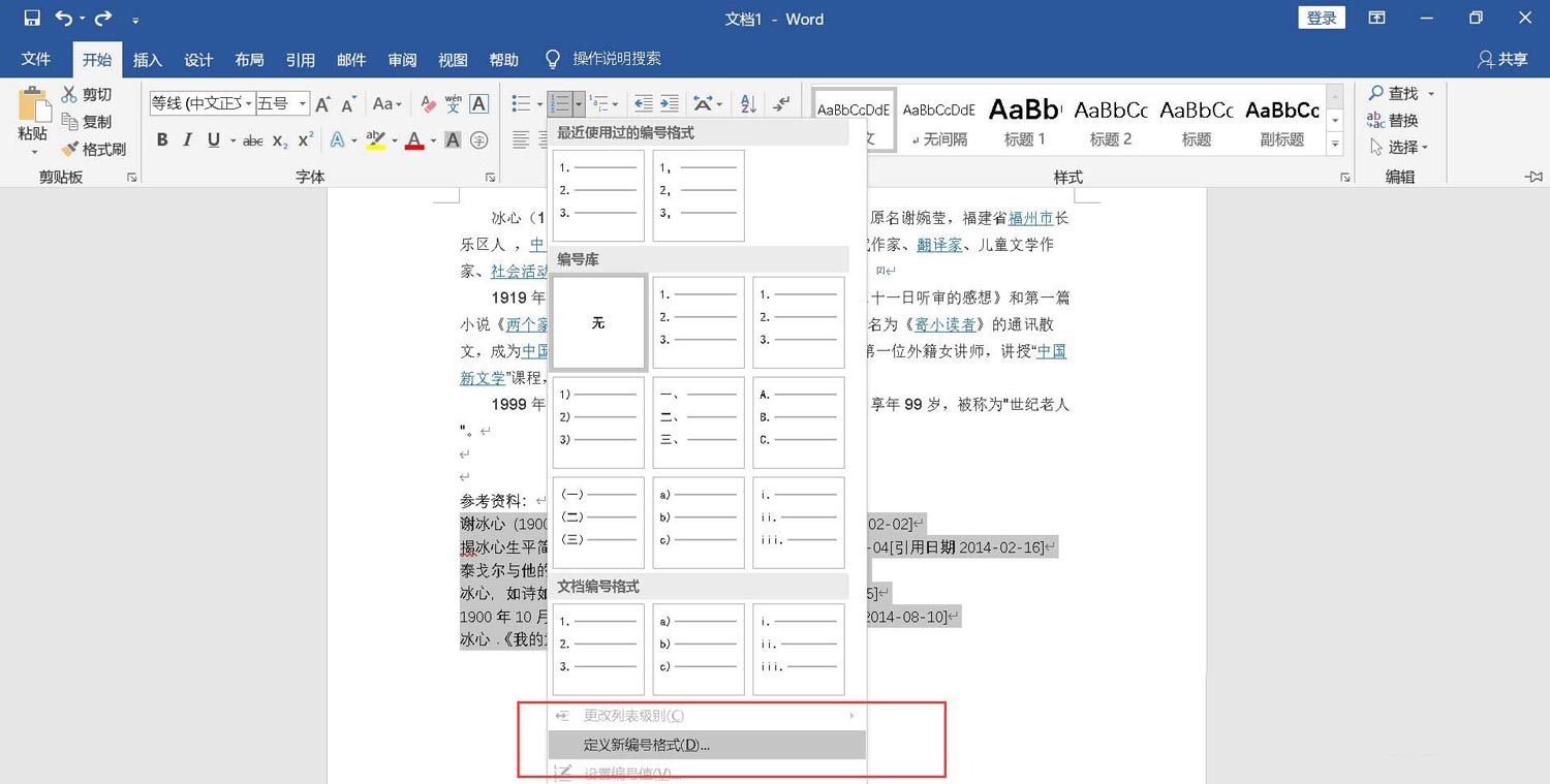 选中参考资料,点击菜单栏上的"开始-编号",下拉选择"自定义编号格式"。