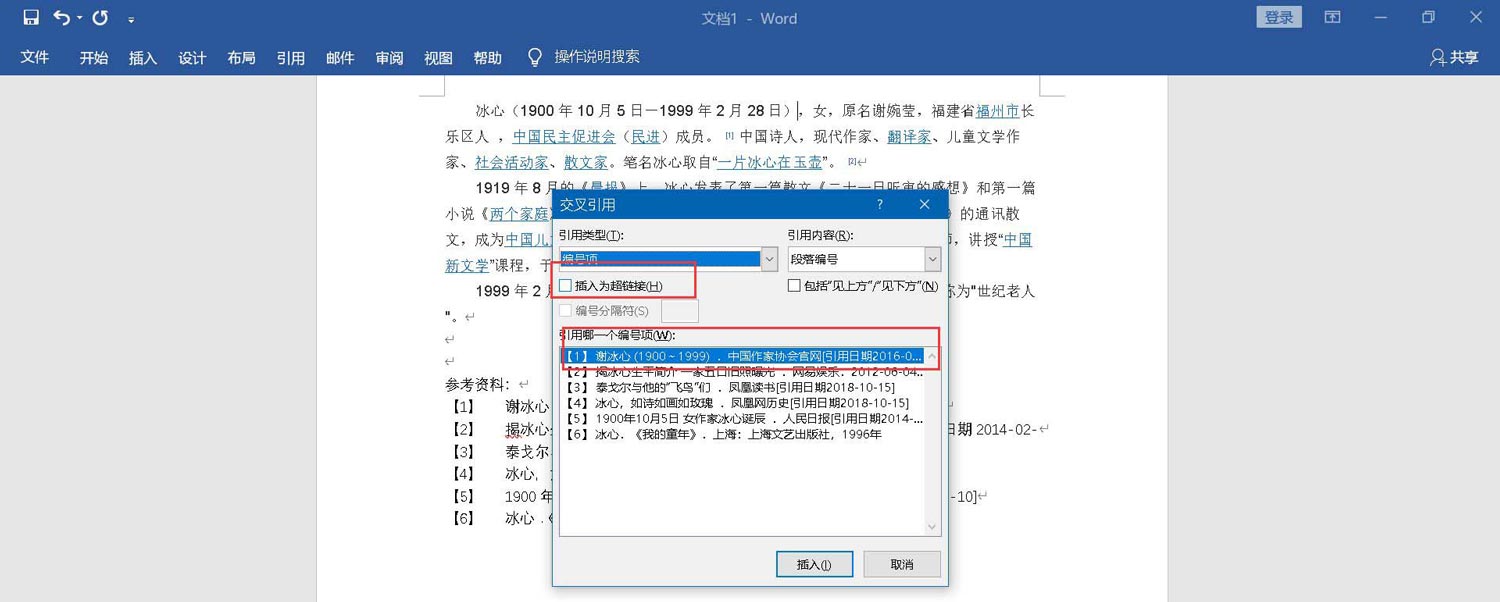 打开的对话框里去掉勾选"插入为超级链接",并选择合适的参考编号。