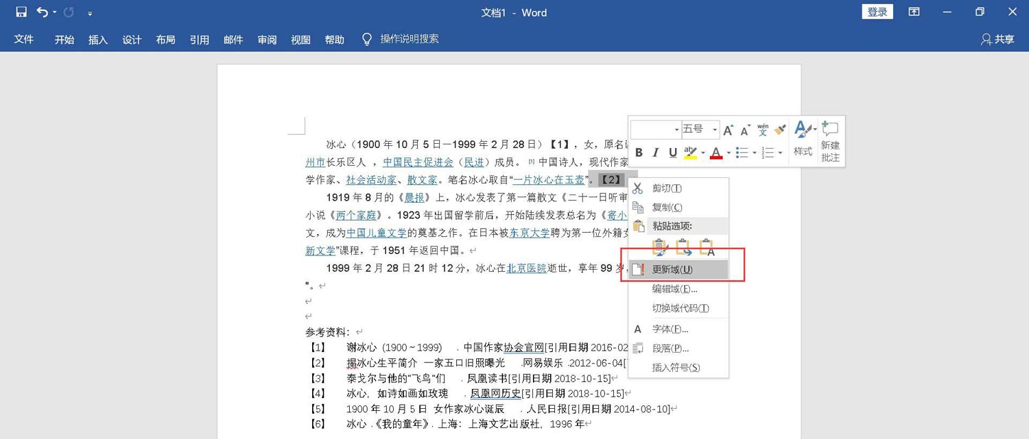 下方参考资料编号如有变动,鼠标移动到参考源,点击鼠标右键,选择"更新域"即可。