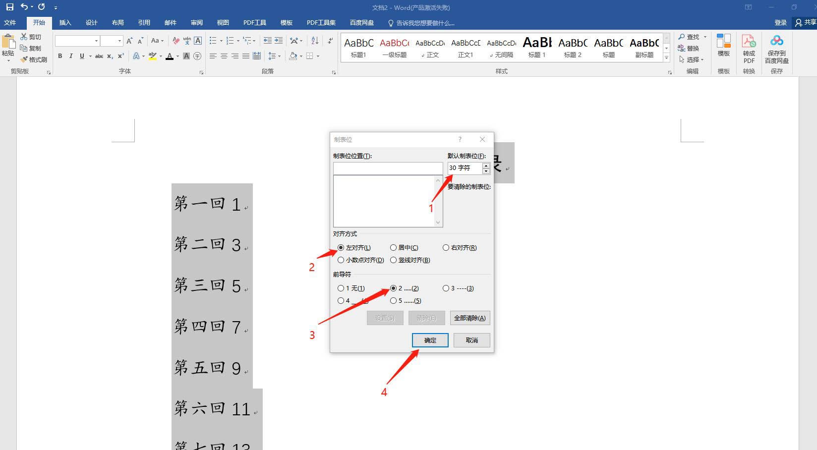 默认制表位选择30,(这个数字可以根据你自己纸张大小调整,我这里是A4纸)如果想让数字再往后点,把数字设大点就OK,然后选左对齐,前导符选2,点击确定