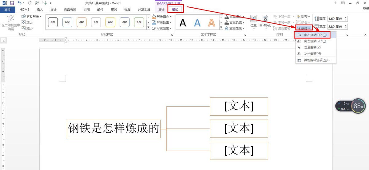 在一级文本框输入"钢铁是怎样炼成的"——点击格式——旋转——向右旋转90°。