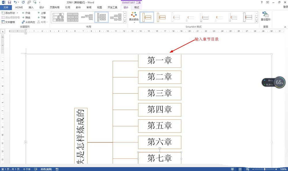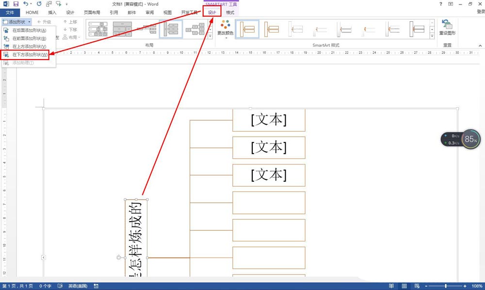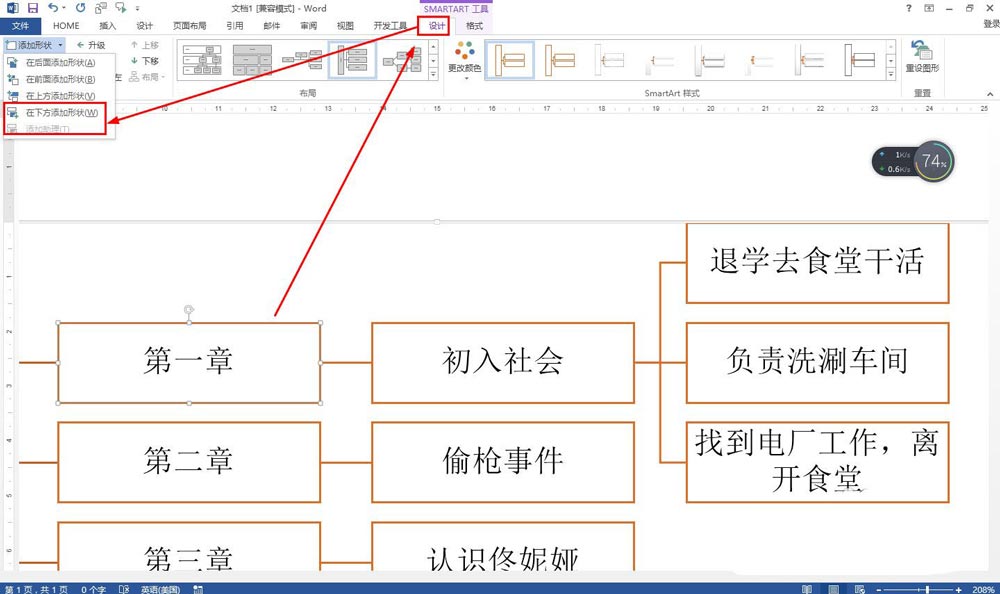 点击二级文本框中的"第一章"——点击设计——添加形状——在下方添加形状。然后输入下级的解说内容,可以再添加下级分支。