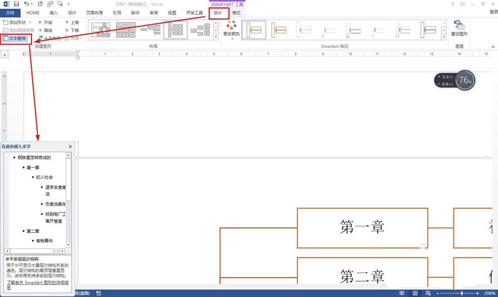 也可以点击设计——文本窗格,在文本窗格中输入相关分支内容,然后保存文档。