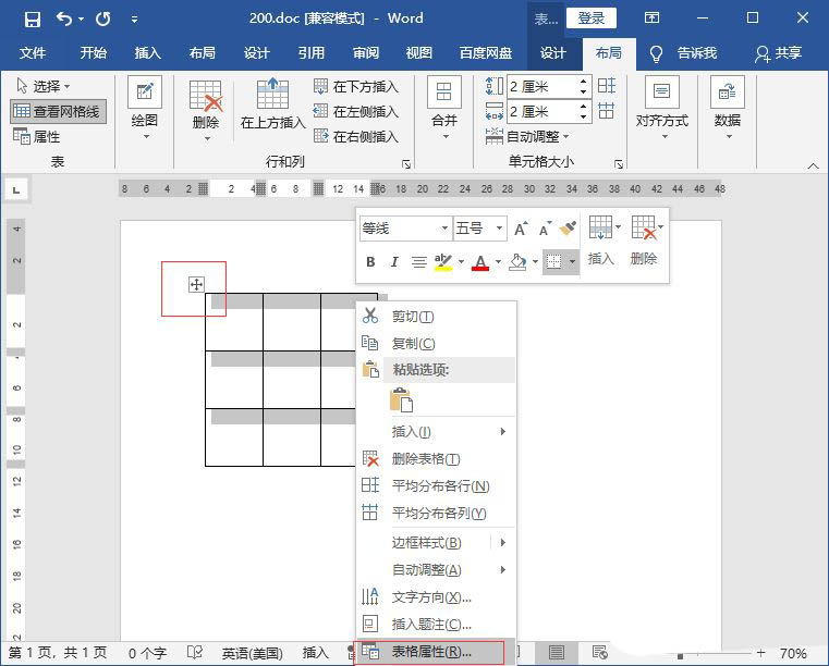 选中表格,鼠标右键点击"表格属性"。