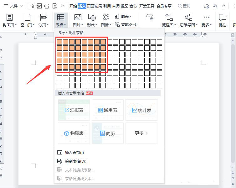接着,我们点击表格,然后根据自己的需要选择表格的行和列,比如:【5行*8列】的表格。