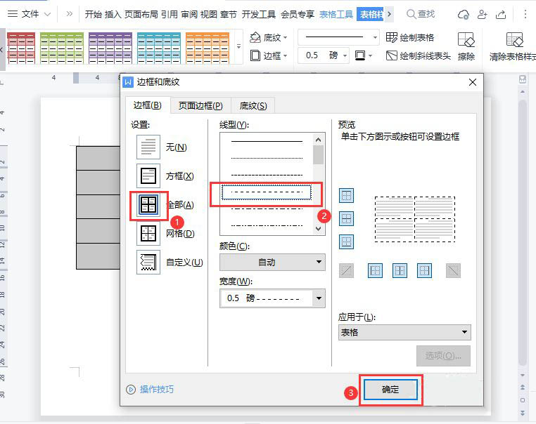 我们在边框和底纹里面,点击【全部】选择【虚线】样式,然后点击【确定】。