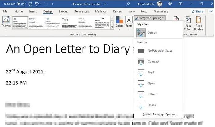 转到"设计">"段落间距">"自定义段落间距"。它将打开管理样式窗口,您可以在其中更改冷杉段落前后的间距,然后您还可以更改行间距。