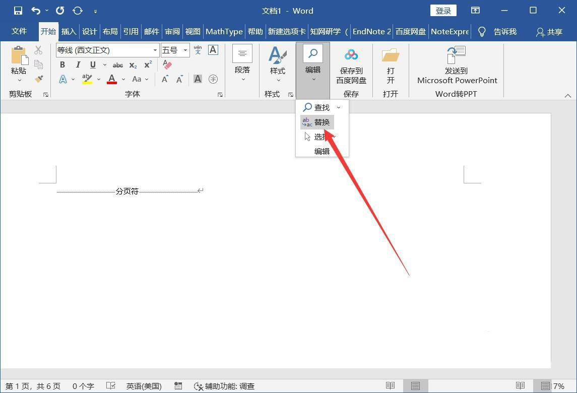 返回文档,点击【开始】-【编辑】-【替换】。