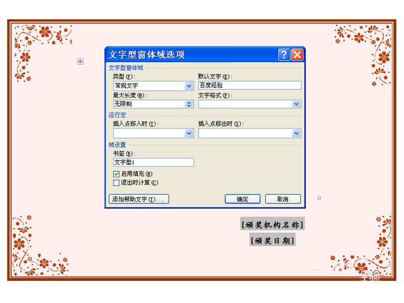 6、对每一个文字域都进行类似的设计,这样就完成了奖状的设置。