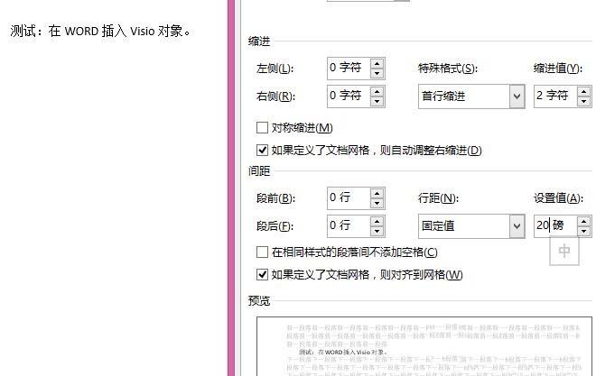2、我们在Word中编辑一段文字,并插入刚才的Visio图。插入方式有很多,可以自行百度。 注意,这里的"段落格式-行距"是"固定值:20磅"