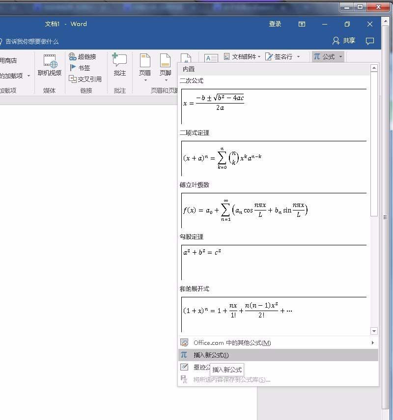 2、在【插入】菜单下最右边选择【公式】下拉列表——选择【插入新公式】