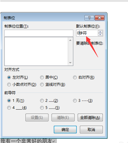 5、编辑为0字符。接着可以看到这的制表位是2字符,这就是为什么会有空格的原因了,将这的字符改为0字符,这样就可以将空格取消掉了。
