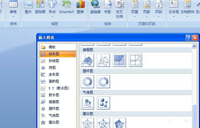 1、 打开一个word的文件,鼠标左键单击菜单【图表】>>【图表列表】,可看到下拉列表中有很多图表,如下图所示。