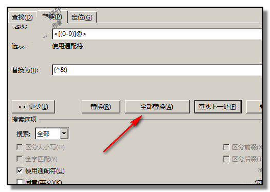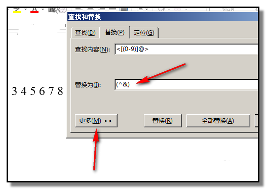 4、在"替换为"这里输入代码:(^&),再点下"更多"按钮