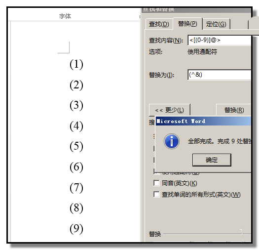 6、再点击"全部替换",关闭操作框;可以看到文档中的数字已全部一个不漏的加上了括号。