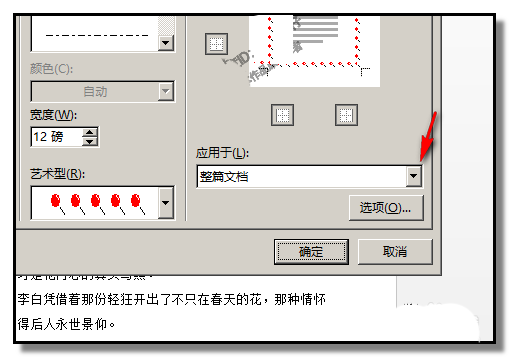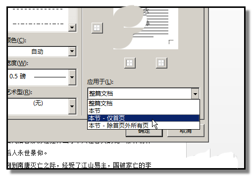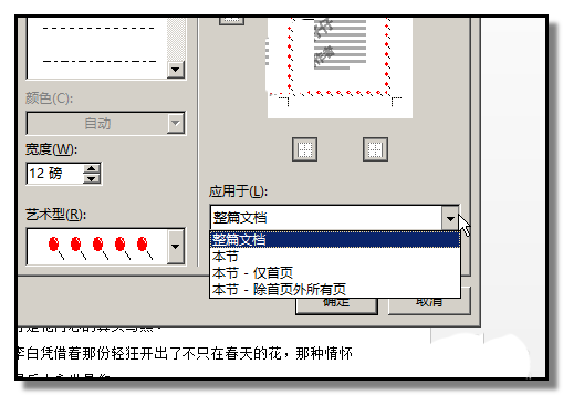 5、在"应用于"这里,默认是此边框是应用于整个文档。我们可以点下小三角,在弹出的菜单中选择此边框应用于哪个。