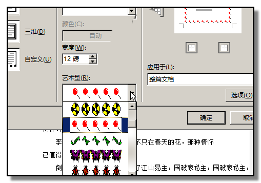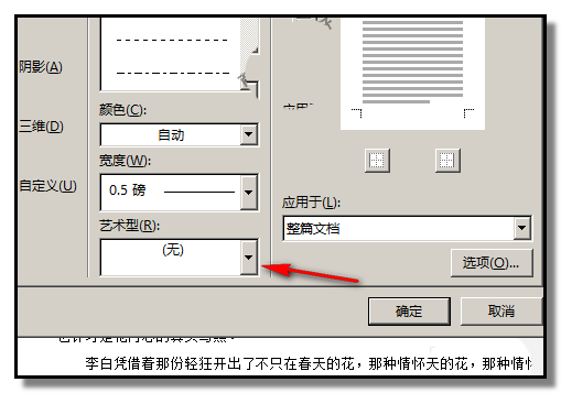 3、弹出"边框和底纹"操作框;在框的"艺术型"这里的小三角点下。