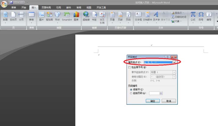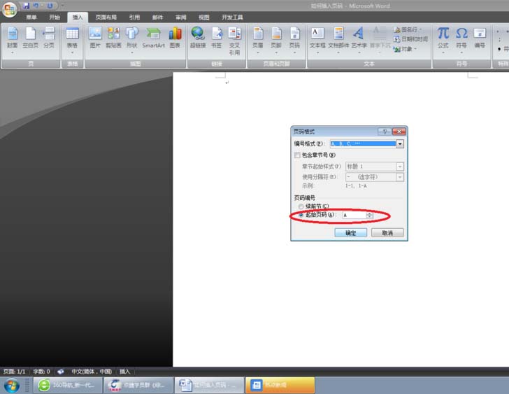 6、选择好开始字母后,点击对话框,就添加页码完成。(这里说明,选择英文字母默认是从A开始,如果需要改动,就根据第五步,修改就行。)