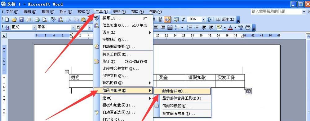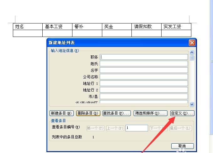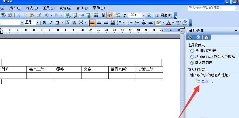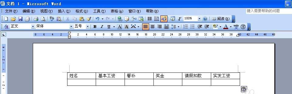 1、新建word文档,如图绘制一个二行的工资表,第一行为标题,即工资表的项目名称。