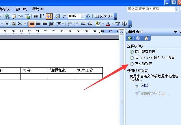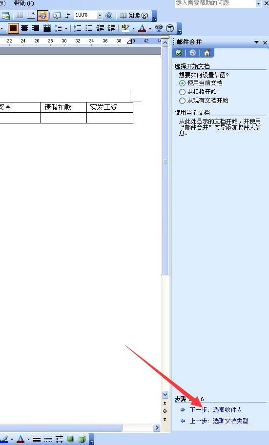 3、在右侧出现的邮件合并功能底部点击"下一步:正在启动文档";继续点击"下一步:选取收件人";到上部点击"键入新列表",如图。