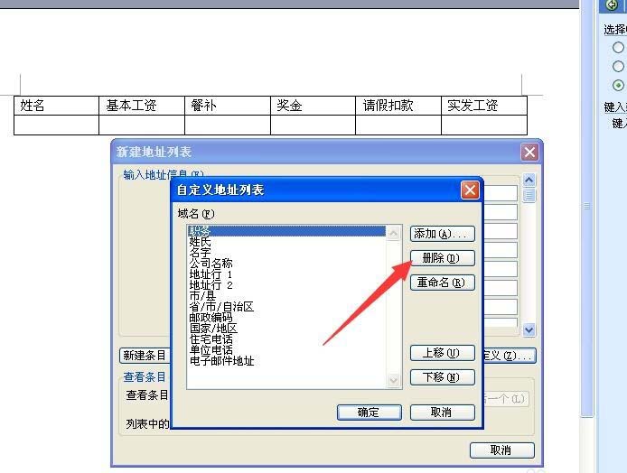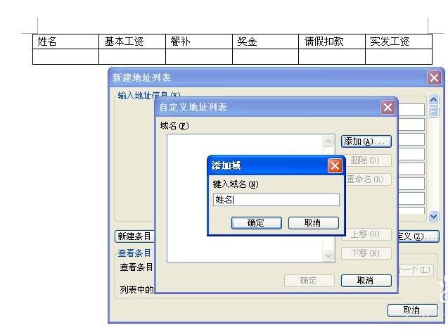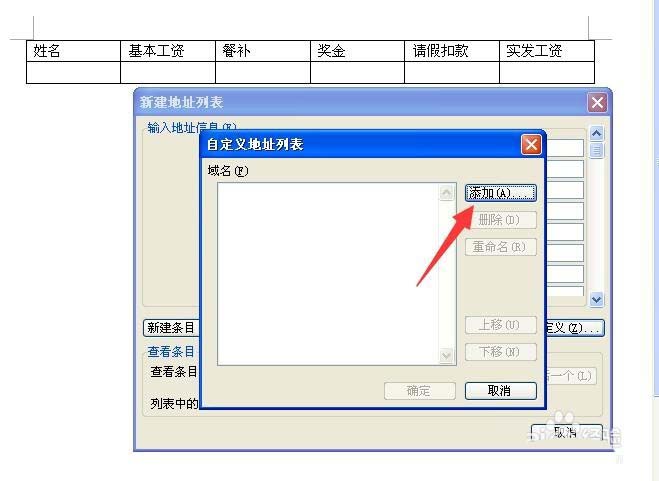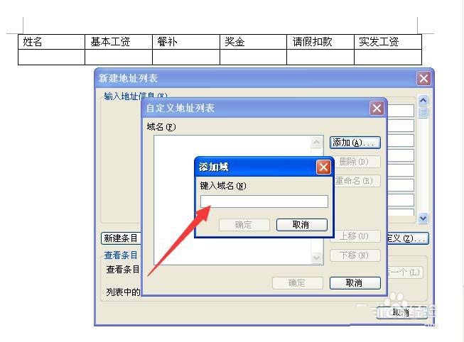 5、点击添加,键入域名,即工资项目标题,录入一个后确定,再添加下一个,一直把所有工资项目都录完,确定。