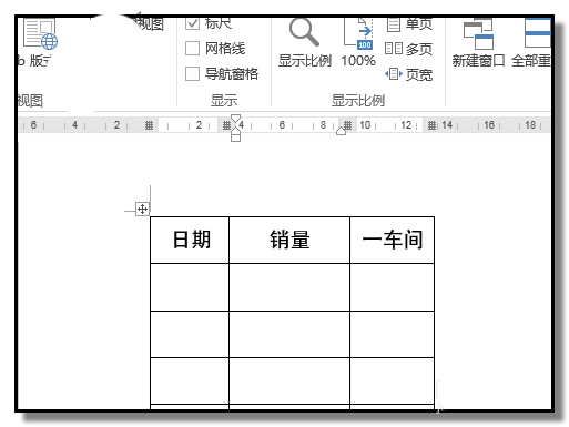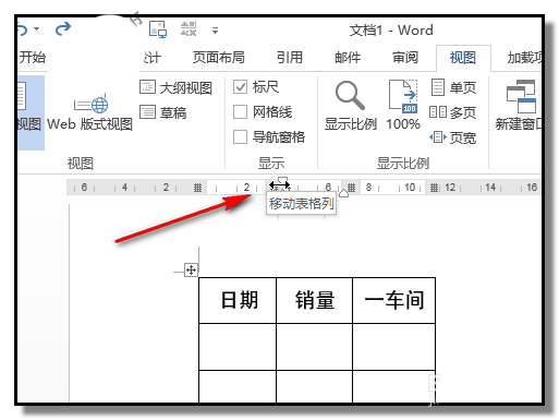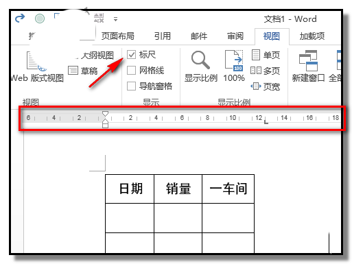 3、那么,如何在不影响相邻列的情况下调整指定的列宽呢?操作如下:先调出标尺,点击"视图",在下方的"标尺"这里打上对勾。可以看到,文档上方显示出标尺了。