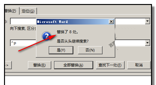7、按下:全部替换,弹出系统提示,提示替换了8处,关闭对话框。看到文档中的本来4行3列的数据变成了一行了。