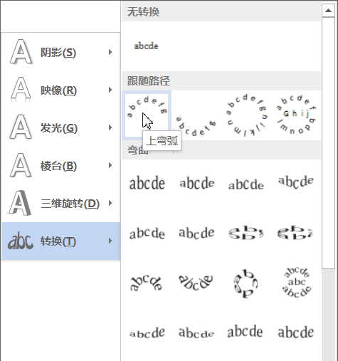 2、在弹出的下拉列表中选择"转换→上弯狐"命令。