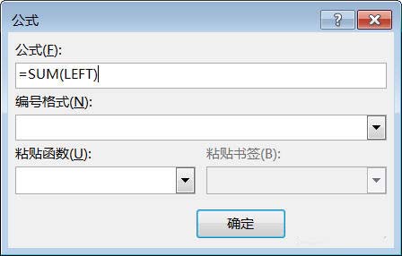 2、弹出"公式"对话框,此时,在公式文本框中自动显示公式"=SUM(LEFT)",单击"确定"按钮。该公式表示对单元格左侧的数据进行求和。