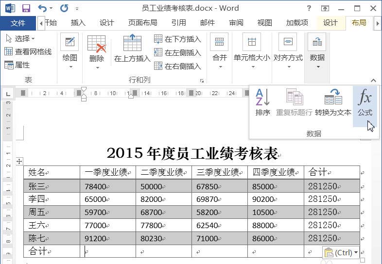 1、将鼠标定位在要插入公式的单元格中,在"表格工具"栏中,单击"布局"选项卡;在"数据"组中单击"公式"按钮 。