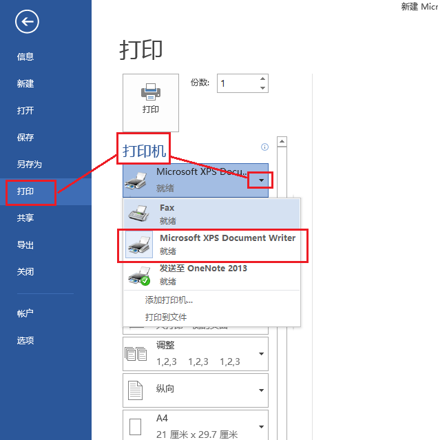 2、点击【打印】命令;然后在【打印机】下拉的列表当中选择一些支持打印A3幅面的打印机(例如系统的"Microsoft XPS Document Writer"虚拟打 印机),如下图: