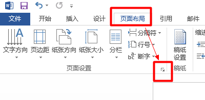 4、单击【页面布局】选项卡;→点击【页面设置】组的对话框启动器按钮,如下图所示:
