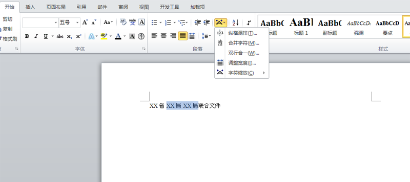 2、选择中间的XX局文字,执行开始-中文板式命令,弹出下拉菜单。
