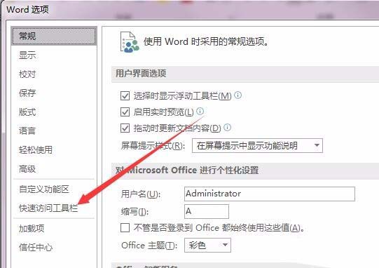 3、在打开的Word选项窗口中,我们点击左侧边栏的"快速访问工具栏"菜单项