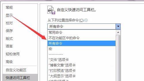 4、接着在右侧的"从下列位置选择命令"下拉菜单中选择"所有命令"菜单项