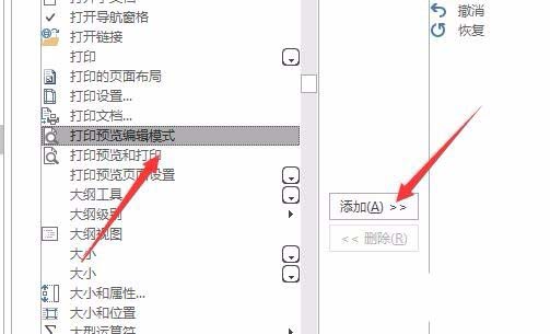 5、在下拉的菜单中找到"打印预览编辑模式"菜单项,选中该项后点击中间的"添加"按钮,把该项加入到快速访问工具栏