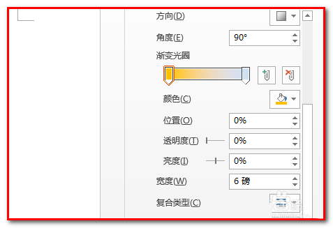 4、下方弹出设置渐变边框的各项;现在设置渐变的颜色,比如,设置图片边框渐变颜色为淡黄到红的渐变,鼠标点渐变光圈的左边色块,选择黄颜色,