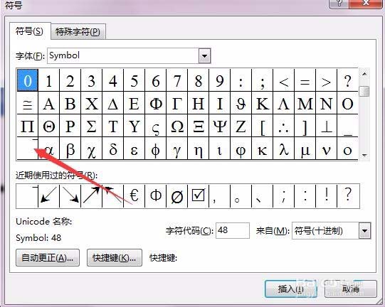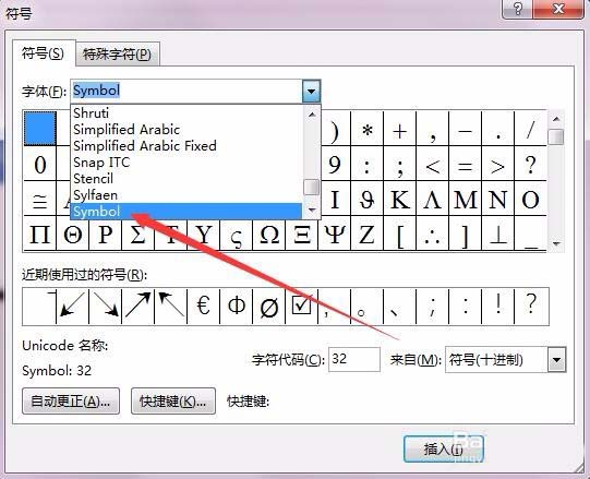 4、在符号窗口中我们点击"字体"下拉菜单,在弹出菜单中选择Symbol菜单项