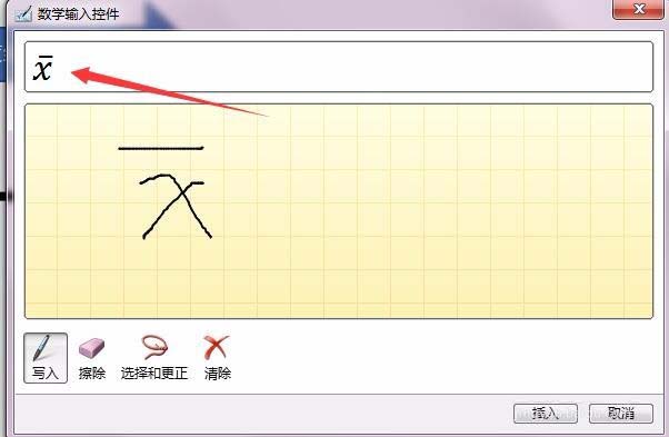 4、这时会打开word2016的数学输入控件窗口,我们在这里用鼠标手工写一下X平均值的符号,然后上面会自动识别出X平均值符号,再点击插入按钮就可以了。
