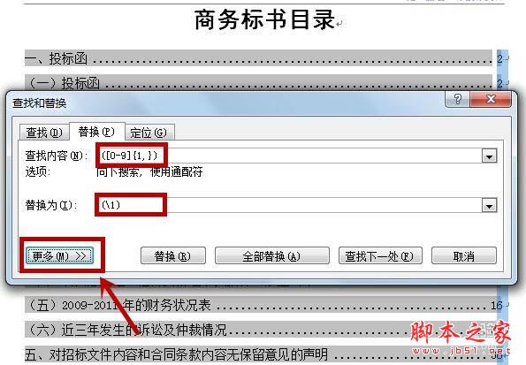 2、按住Alt键移动鼠标选择要加括号的页码这一列,然后按Ctrl+H,弹出替换的窗口,在查找内容栏输入([0-9]{1,}),在替换栏里输入(1),点击下面的更多按钮。