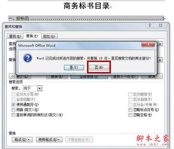 4、替换完后会显示已替换所选择目录内页码已加括号的数量,点击否。若点击是,文档将继续搜索整个文档内容,使文档内所有数字都加上了括号。