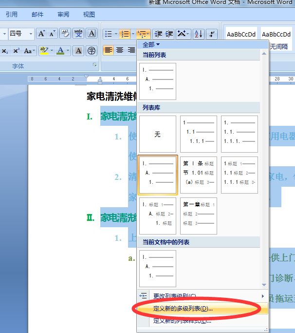 5、如果在多级列表格式里没有自己满意的,也可以自己自定义设置一下。在多级列表下拉菜单中选择"定义新的多级列表"。