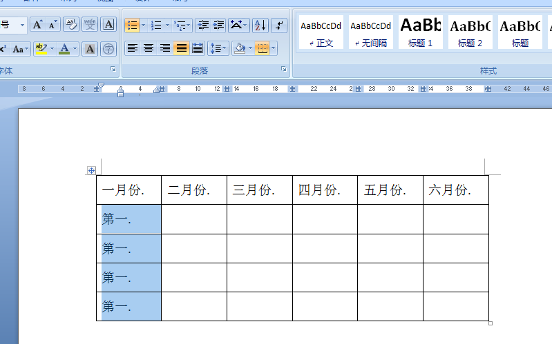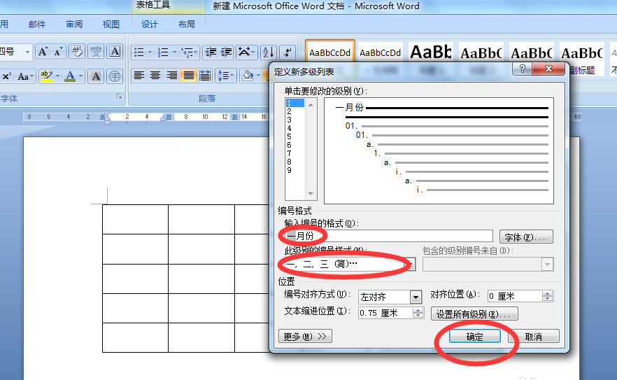 7、首先选中要输入的整行或者整列。调出设置新的多级列表对话框来进行设置。这里就以输入月份为例,选中编号样式为大写的一、二。。。。。,然后在编号格式设置那里在一后面再添加上月份两个字,整体为"一月份"。设置完成以后点击确定即可完成。列的设置同理。这样就比较快速方便。