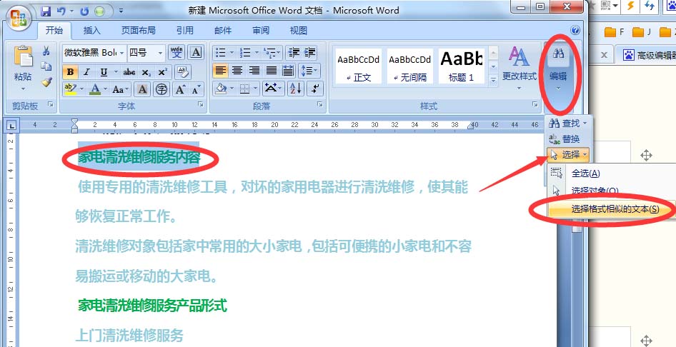 2、首先选中一个第一个级别的一个字或者一行字都可以。在word编辑栏下找到选择选项。在选中选项中有一个"选择格式相似的文本"选项,点击选择这个选项就可以把文档内这个级别的内容快速的选择。同理其他级别的文字也可以快速的选择。