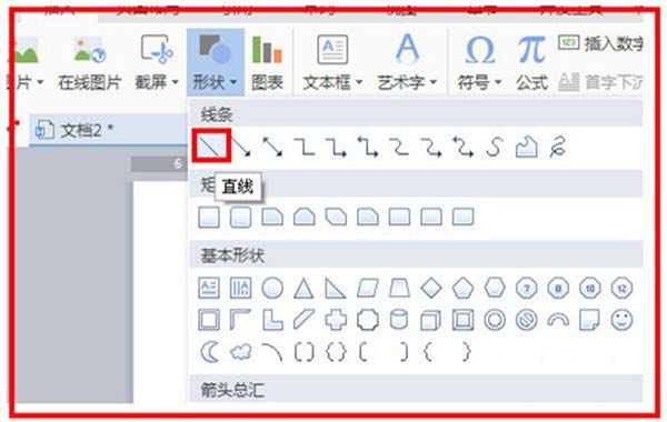 3、现在开始插入横线,找到插入,单击一下,找到形状,单击一下,选择直线,单击选中直线。